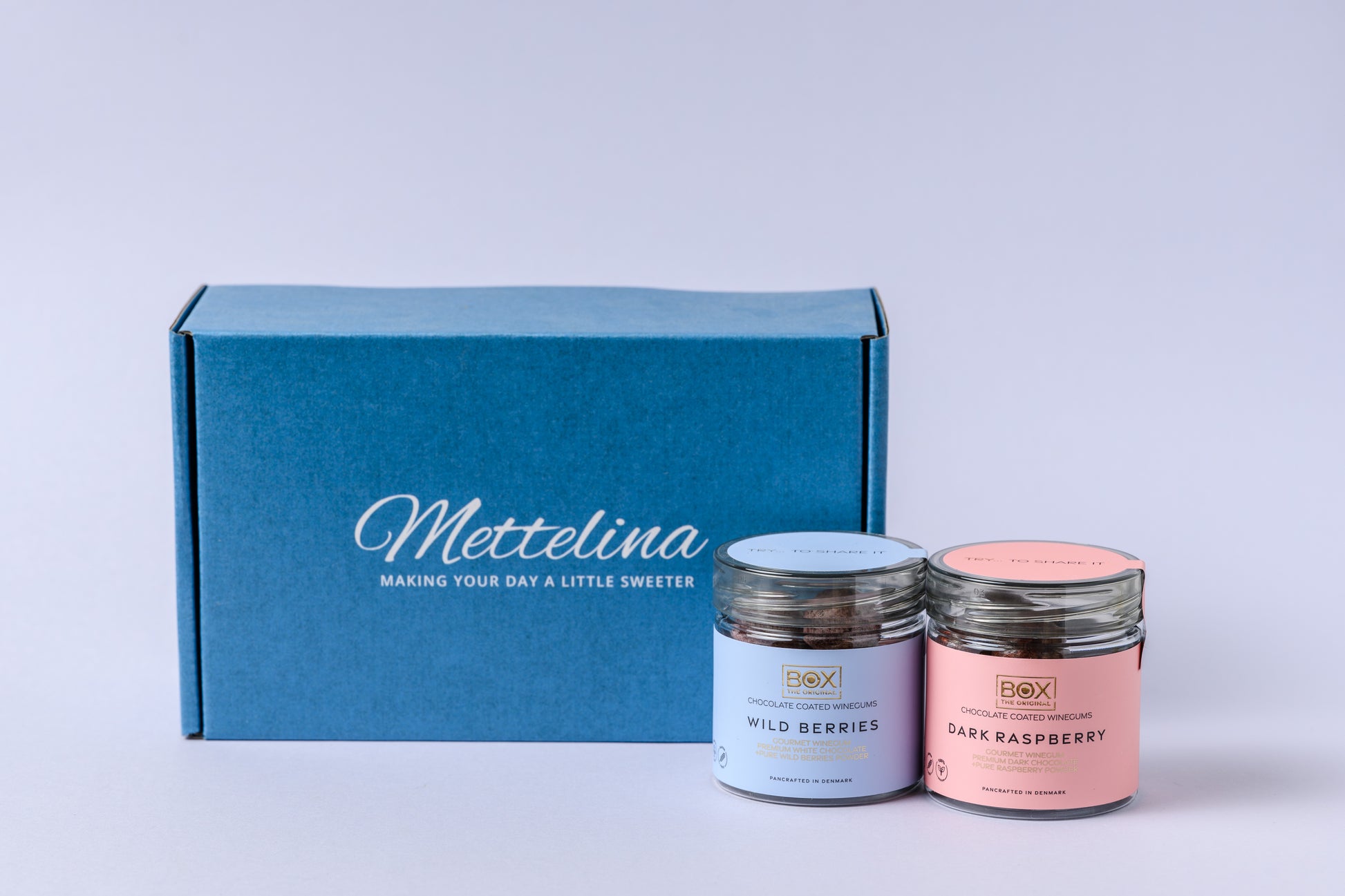 This gift set includes 2 small jars of our delicious Danish gourmet winegums. These delicious gummies are enrobed in premium chocolate and rolled in the highest quality and natural fruit powder. All gelatin free and gluten free, Flavours will vary depending on whats in stock and season. Beautifully packed in a stylish gift box, it’s the perfect present if you want to give someone a different and truly special treat.